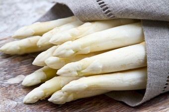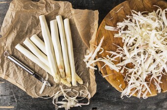 Pel en snipper de sjalotten. Schil de asperges. Snijd de kopjes van de witte asperges en de rest in stukken. Kook de stukjes voor 5 minuten en laat voor 10 minuten nagaren in het water.