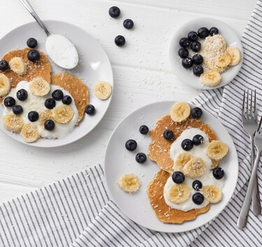 Serveer de pancakes met de overige bessen, leg er plakjes banaan op en lepel er Griekse yoghurt en maple syrup over.