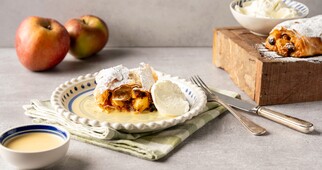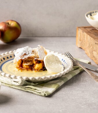 Deze krokante bladerdeeglekkernij is een favoriet onder wintersporters: gevuld met warme appel en geserveerd met een romig laagje vanillesaus en verse slagroom.