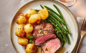 Zachtgegaard lamsvlees met paprikamousse, peultjes, rucola en ingekookte sherry