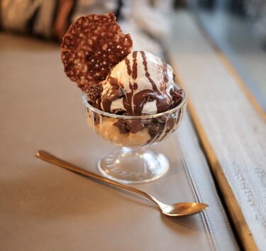 Top het geheel af met chocoladesaus (smelt hiervoor 100 g chocolade au bain-marie) en stukjes luchtige chocolade, zoals Bros. Serveer in een feestelijke coupe!