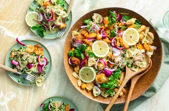 Schep de pastasalade op de borden. Bestrooi met de croutons, de ingemaakte ui, citroenzest en de en schijfjes citroen overgebleven waterkers.