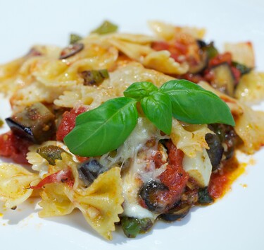 Verwarm de oven voor op 180 ºC. Schep in een ovenschaal de helft van de tomatensaus. Schep de pasta erover en vervolgens een laagje aubergine en paprika en strooi er oregano over. Scheur de mozzarella in stukjes en verdeel over de aubergine en paprika. Dek af met een laagje pasta en de andere helft van de saus. Rasp de Parmezaanse kaas eroverheen. Bak in de oven in circa 10 minuten goudbruin.