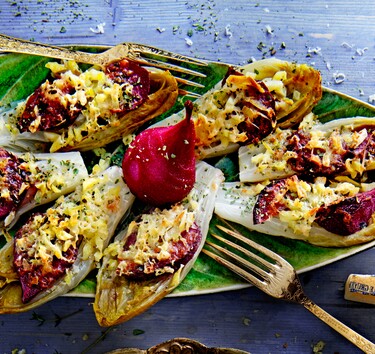 Gegratineerde witlof met stoofpeer, rösti en gruyère