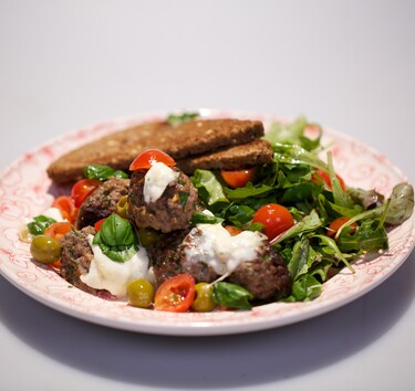 Verwarm de oven voor op 200 °C. Scheur 2 boterhammen in kleine stukjes en leg ze in een kom. Schenk de melk erbij en laat het brood de melk opzuigen. Pluk en snijd de peterselie fijn. Pel en pers de knoflook. Voeg het gehakt, de peterselie en de knoflook toe aan de kom. Breng op smaak met een beetje zout en versgemalen peper. Kneed het gehakt en draai er kleine balletjes ter grootte van een pingpongbal van. Verhit olijfolie in een koekenpan. Bak de gehaktballetjes in circa 3 minuten rondom bruin. Schep de gehaktballetjes in een ovenschaal. Snijd de mozzarella in blokjes. Halveer de cherrytomaten en knijp de zaadlijsten/vocht eruit (dit om te voorkomen dat het gerecht te nat wordt). Verdeel de cherrytomaten en de mozzarella over de gehaktballetjes. Voeg de olijven toe. Bak de gehaktballetjes in de oven in circa 15 minuten gaar. Pluk de basilicum en verdeel de blaadjes over de gehaktballetjes.