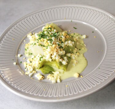 Maak ondertussen een vinaigrette van de olie, azijn, mosterd en mayonaise en breng op smaak met zwarte peper en zout. Pel de eieren en prak ze fijn. Serveer de prei met de vinaigrette erover en de ei ernaast.