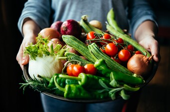 - Snipper de uien en snijd de knoflook fijn. Snijd vervolgens de paprika, aubergine en courgette in gelijke kleine blokjes. Ris de rozemarijn en tijm van de steeltjes en snijd het fijn.