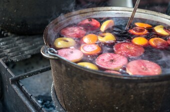 Laat het geheel 30 à 40 minuten op een laag vuurtje staan, ook nu zonder dat de glühwein kookt.