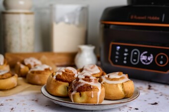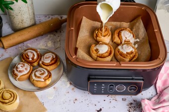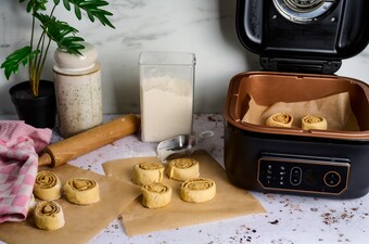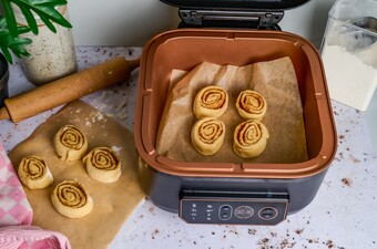 Als je de piep hoort die aangeeft dat de airfryer op temperatuur is, leg dan voorzichtig het eerste stuk bakpapier met kaneelbroodjes in de airfryer. Laat 15 minuten bakken tot de timer afgaat. Herhaal deze stap voor de tweede en derde bakronde.