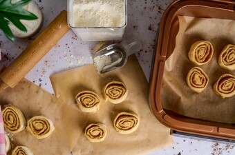 Snijd de rol met een scherp mes in 12 even dikke plakken. Leg de 3 vellen bakpapier op je werkblad en leg op elk vel 4 kaneelbroodjes. Dek af en laat de broodjes 20-30 minuten staan om nog wat te rijzen.