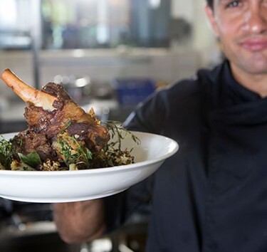 Schep de bloemkool-bonenpuree op het bord en leg daar de gefrituurde salieblaadjes op. Doe daar de gremolata met bonen en bloemkoolroosjes op. Zet de lamsbout rechtop de puree en garneer met wat bloemkoolroosjes.