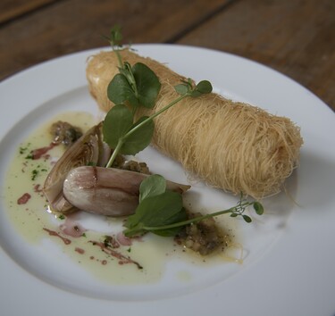 Mix de doradefilets met melk, coquilles, eiwitten en beetje room tot een gladde massa in de mixer. Klop de rest van de slagroom tot yoghurtdikte en spatel door de farce. Breng op smaak met zout en peper. Leg 2 tongfilets op plakfolie met de mooie kant naar buiten. Spuit een streek flan in het midden van de tong, rol op zodat de flan in het midden zit. Gaar het rolletje op 100 °C circa 6 minuten en koel af op ijswater. Haal uit de folie en rol door de losgeklopte eidooiers. Maak een mooie baan kataifi en rol het rolletje erin. Verhit olie in de pan en frituur circa 3 à 4 minuten.