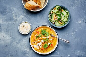 Snijd de aubergine in schuine plakjes. Snijd de viscake in reepjes. Maak de garnalen schoon. Bak de aubergine, viscake en garnalen voor 2 min in de pan met de currypasta.