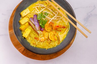 Voeg de noodles en de taugé toe en verwarm voor 1 min mee. Verdeel de soep over kommen en garneer met koriander.