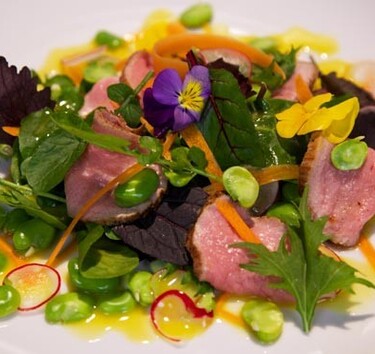 Verdeel de slasoorten over het midden van borden en spuit er dressing over. Rangschik er tuinboontjes, wortel en radijs over. Snijd de rosbief in flinterdunne plakken en dresseer enkele plakjes over de salade. Spuit er nog iets dressing over en enkele korrels grof zeezout en zwarte peper uit de molen.