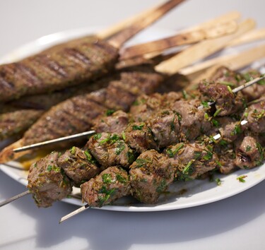 Rooster het komijnzaad kort in een hete koekenpan. Snijd de koriander fijn. Pel en rasp de teentjes knoflook. Meng dit alles door elkaar en roer er een scheut olijfolie en het sap van een citroen door. Snijd het lamsvlees in grove blokjes en kneed de marinade erdoorheen.
