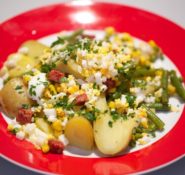 Verdeel de menestra over de borden. Garneer met de gehakte eieren en peterselie.