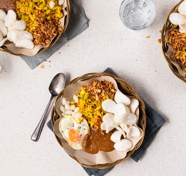 Serveer de nasi goreng met een gebakken ei, pindasaus, kroepoek, gebakken uitjes en zilveruitjes.