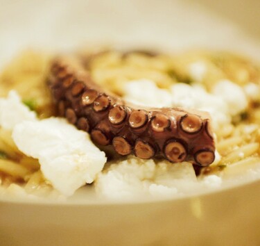 Verwarm de olijfolie in een pan en fruit de knoflook en de sjalotten aan. Voeg de tomatenpuree toe, en na een minuut ook de fijngesneden tomaten, 1 liter bouillon en de tomatensap. Breng het geheel aan de kook. Voeg vervolgens de octopus, 1 theelepel oregano, 2 laurierblaadjes, 1 kaneelstok en 4 piment korrels toe. Kook het geheel ca 15 min tot de octopus mals is. Voeg 100 gr Manestra pasta toe en breng het al roerend aan de kook.