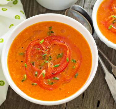 Verdeel de paprikasoep in kommen en serveer met basilicum.