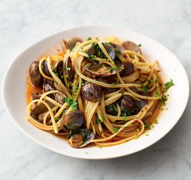 Kook de pasta volgens de aanwijzingen op de verpakking in gezouten kokend water, maar giet hem 1 minuut eerder dan aangegeven af. Vang een kopje van het kookwater op. Controleer intussen de vongole en geef open exemplaren een tik – als ze dan niet dichtgaan moet je ze weggooien. Trek de ’nduja in stukjes in een grote, koude koekenpan met antiaanbaklaag, giet er 1 eetlepel olijfolie bij, zet de pan op matig vuur en laat de ’nduja smelten terwijl je de peterselie (met steeltjes en al) fijnhakt. Roer het grootste deel van de peterselie met de vongole en rosé door de gesmolten worst en leg een deksel op de pan. Als het goed is gaan de schelpjes na 3 of 4 minuten open – blijf de pan regelmatig schudden, neem hem van het vuur en gooi schelpen die na die tijd nog steeds dicht zijn weg.