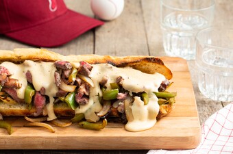 Snijd de ribeye in dunne plakjes. Bedek het stokbrood met de groentemix, plakjes ribeye en kaassaus. Maak eventueel af met wat zwarte peper.