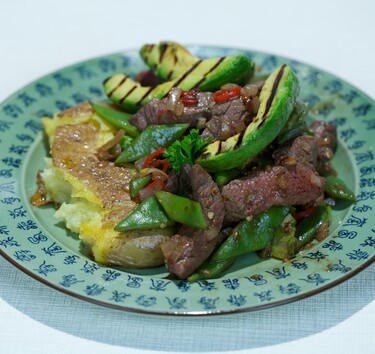 Serveer de runderreepjes met de aardappel en gegrilde avocado.