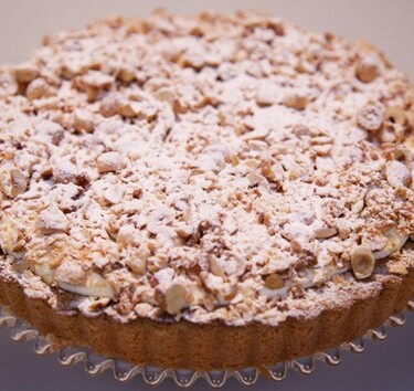 Verdeel de hazelnootnougatine over de Zwitserse room. Bestrooi de taart met poedersuiker.