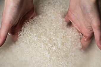 Voeg de rijst toe aan de ui en bak circa 2 minuten mee op middelhoog vuur, terwijl je blijft roeren. Blus af met witte wijn en wacht tot het vocht bijna is opgenomen. Schep dan lepel voor lepel de bouillon (1L) erbij. Blijf roeren en kook de risotto in circa 15/20 minuten gaar.