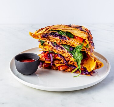 Beleg ¼ van de wrap met de nachosaus, ¼ met rode kool en tomaatjes, ¼ met tempehreepjes en het laatste kwart met vegan kaas en babyspinazie. Vouw de kwarten met de klok mee over elkaar.