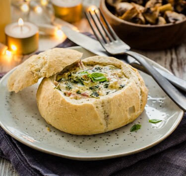Mix dit met het ui-spekjesmengsel. Verdeel het kaasmengsel over de vier bollen. Zet ze in een voorverwarmde oven. Bak ze ongeveer 15 minuten. Maak ondertussen de champignons schoon en bak ze totdat ze gaar zijn. Serveer de gevulde bollen over de borden en serveer er een bakje cherrytomaatjes, een bakje champignons en een bakje broodkruim (brood uit de bollen) bij.