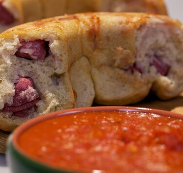 Pel en snipper de ui. Pel en hak de knoflook fijn. Verhit een scheut olijfolie in een pan en fruit de ui en knoflook. Voeg de gepelde tomaten en de oregano toe en laat circa 20 minuten doorkoken. Breng op smaak met een beetje zout en peper. Serveer de saus bij het warme monkeybread.