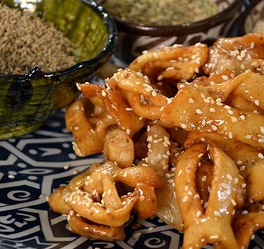 Meng de bloem met de gemalen zaadjes, kaneelpoeder, gist, bakpoeder en het zout. Voeg de rest van het oranjebloesemwater, azijn, zonnebloemolie en het lauwwarme water toe en kneed tot een soepel en droog deeg. Snijd het deeg in dunne plakken en haal het deeg een aantal keer door de pastamachine. Begin met de grootste stand en zet de machine steeds een standje kleiner zodat het deeg mooi dun wordt. De plak moet circa 2 millimeter dun zijn. Snijd met een gekarteld wieltje vierkantjes van 4 bij 5 centimeter van het deeg. Snijd het vierkantje 5 keer in op circa een halve centimeter van de randjes zodat alles aan elkaar blijft. Pak het deegplakje op en vouw de randjes om en om. Frituur de shebekia’s tot ze een klein beetje gekleurd zijn, haal ze uit de olie en week ze meteen in het warme honing-oranjebloesemwater. Haal de shebekia’s eruit, leg in een vergiet of zeef en bestrooi met een beetje geroosterd sesamzaad. Laat de overtollige honing eraf lopen.