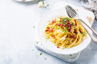 Serveer de traditionele spaghetti carbonara met extra geraspte Pecorino.