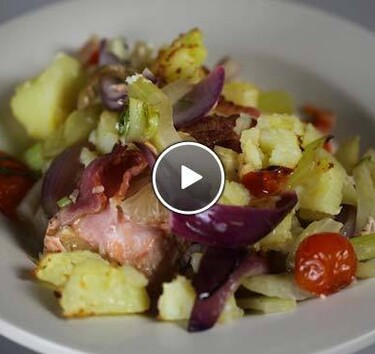 - Strooi de aardappels erover en leg de cherrytomaatjes erop.