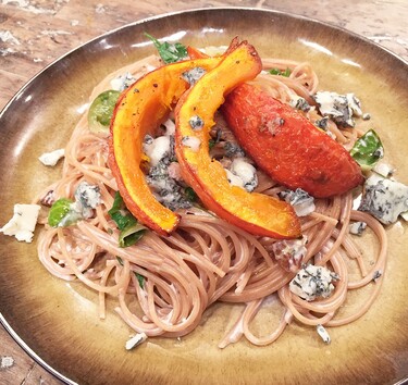 • Schep de spaghetti op bord, leg de pompoen erbij en bestrooi met gorgonzola.