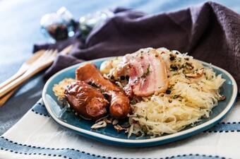 Doe de zuurkool samen met de jeneverbessen en de laurier in een pan. Voeg een een scheutje water of wijn toe en breng aan de kook. Draai het vuur laag zodra het kookt en laat het lekker gaar stoven. Let wel op dat het niet droogkookt en aanbrandt. Als het gaar is draai je het vuur uit en verwijder je de jeneverbessen en de laurier. Je kunt de pan nu even aan de kant zetten.